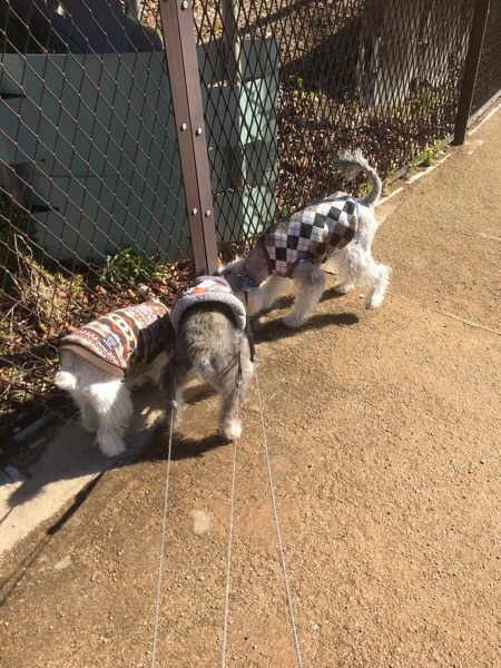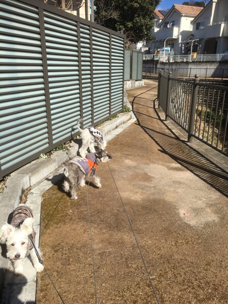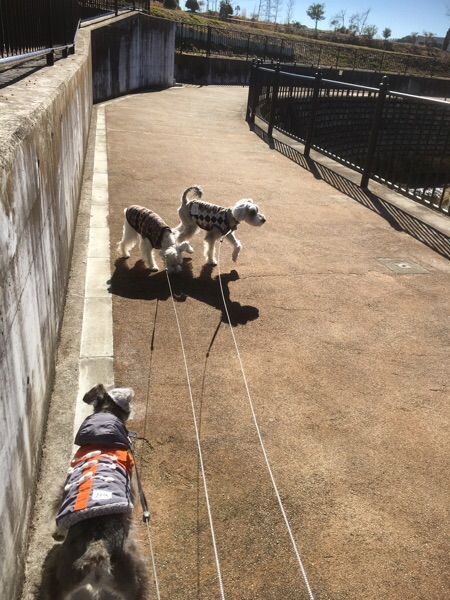 お散歩 じん 2017.02.10 晴れた! 散歩、散歩!!♪( ´▽`) と、出かけたものの、結構寒い…。 でも、今日はちょっといっぱい歩こうね! なのに。 くんくん。 そんなに嗅がなくとも…。 あ、それは、やだ!!(>人<;) 雨の後。 いつもよりいっぱい匂いがして、わんこ達は、楽しそうです。(-.-;) 満足したかい? と、散歩から帰って来てのんびりしてたら、びっくり! 怪しい空だなぁ〜と思っていたら、いきなり吹雪いた!!( ゚д゚) 今日って、こんな予報だったっけ?? 危なかったなぁ…。