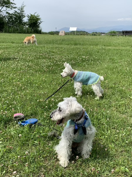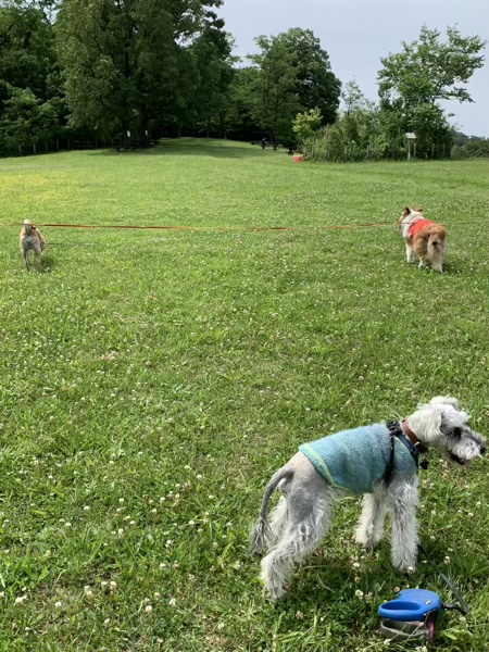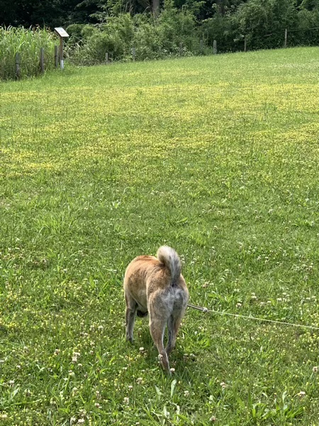 お散歩 じん 2021.05.26 今日はみんなでのお散歩の日。 ただ小春が疲れやすい様で、 ゆっくりと、そして少ししか歩けなくなったんですよね。 換毛が出来てないので、この暑さで参っているのか、 はたまたボディが少し大きく(?)なっちゃったからか。 とにかくムリは禁物! 今日は少しだけ歩いて、広い所で放牧してきました。 あ、もちろんリードは繋いでます! 小春が