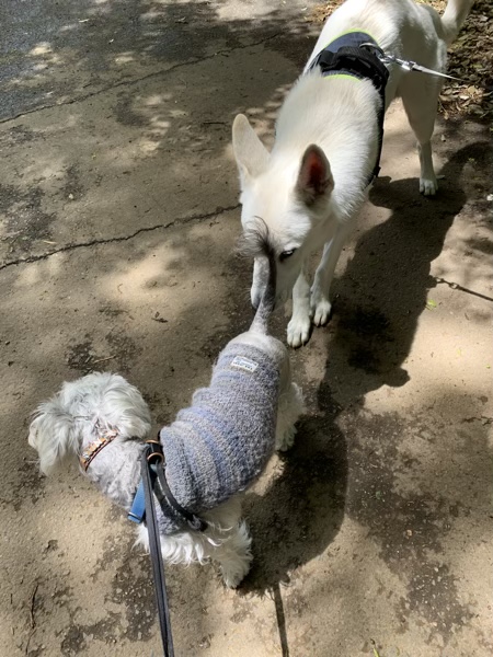 向こうの飼い主さんも、こちらに気を遣って離れていてくれる様子。