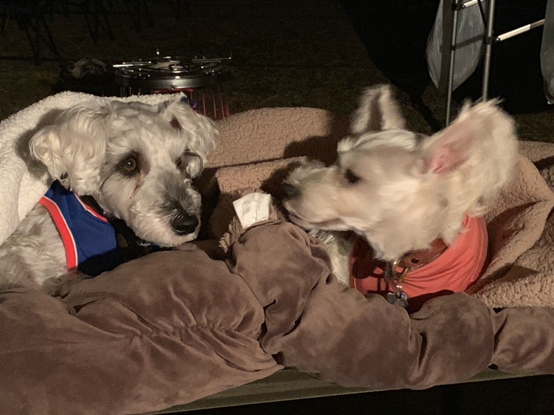 がらーん キャンプ 2018.11.11 昨日と打って変わって。 がらーん。 ほとんどの人が撤収。 ならば。 ダーッシュ!! で。 前からは炭、後ろからはストーブで暖をとり。 ぬくぬく。 ねぇ。 そろそろ君達の時間は終わりだよー。 と、ご飯を食べながら様子を見たら。 気持ち良さそうだねー。(o^^o) …。 寝たふりして、食べ物を見張ってました。 さすがの食い意地。(^^;) 人が減ったキャンプ場は、流石に寒くなってきました。 今日は暖かくして寝ないと。