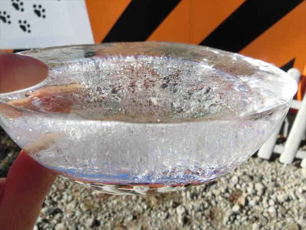 さむーー! ラン 2016.01.25 今日のランでの事。 飲み水を入れようと思ったら、水があわあわ?? と思ったら。 げ! お皿の形で凍っている!! それも、こんなに分厚く…。(゜.゜) 寒いはずです。(^_^;)