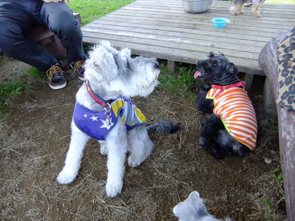 おはぎちゃんは、気になって偵察に、じんは遊んでほしくて追いかけて。