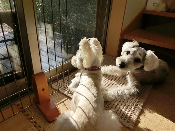 たそがれ中 じん 2016.11.04 「窓、開けてよ。」 残念ながら、今日は無理です。 お天気がいい日が2日間は続き、落ち葉もまだあまり落ちてこない。 となったら、ウッドデッキのペンキ塗りには最適!(^^)/ ということで、 ただいまペンキ塗りたて、ほやほやです。 今デッキに出たら、肉球スタンプになっちゃうよ。 それも可愛いけど。(^^ゞ 年に2日だ、我慢しろ~。 「あーあ。」