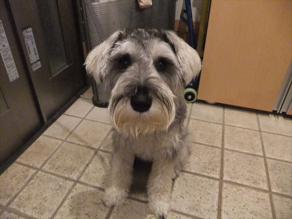 家の外階段の上まで行き、振り返って尻尾を振っています。