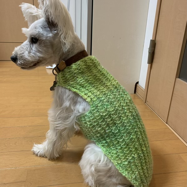 サマーセーター じん 2020.06.25 サマーセーター、仕上がりました! 試着。 後ろからはこんな感じ。 突貫工事で仕上げた割にはまあまあの出来かな?(^^;) 色々思うところもありますが、 しばらくこのまま着てもらうとします。 着ているとどんな感じになるのか、楽しみです。