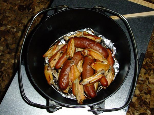 下で手羽を焼いて、ダッチオーブンで燻製を作っています。