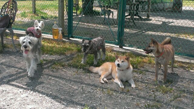 ドッグラン じん 2015.05.11 小春ママに誘われて、ランへ!(^^) 日差しは強いので、ちょっと暑いです。 舐めても涼しくなりませんよー。(^^;) でも、風が涼しいので、日陰はご機嫌! わずかな日陰を、みんなの共有です。(^^) この5匹。 いつものごとく、あまり絡まない割に、 なんとなく、一緒にいたりして、不思議な関係です。 でも、それが結構、心地いいんだよね。(^^) 思い思いに楽しんだ、1時間でした。 小春ママ、写真の提供ありがとね! 明日はカメラ、忘れないよー。(^^ゞ さ、明日もランだぞー!(^^)/