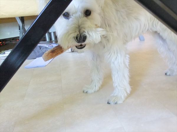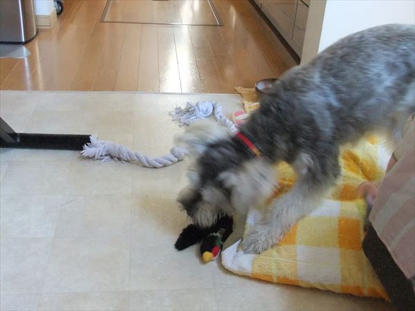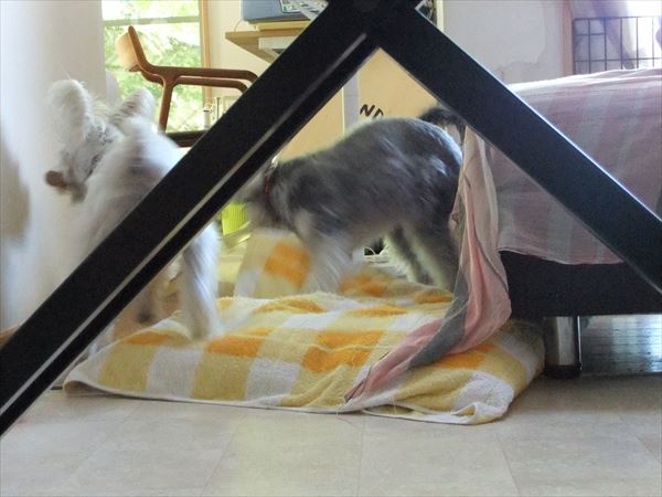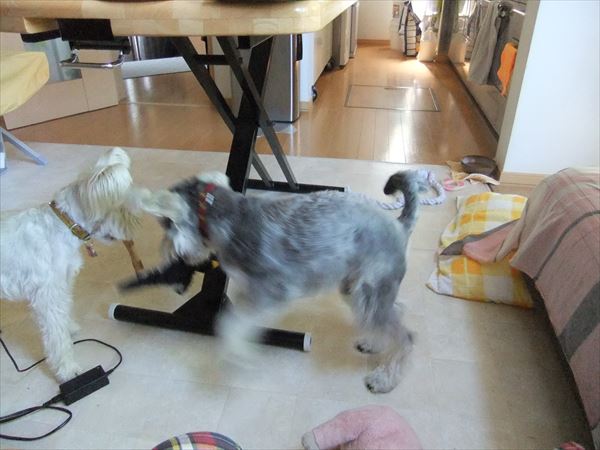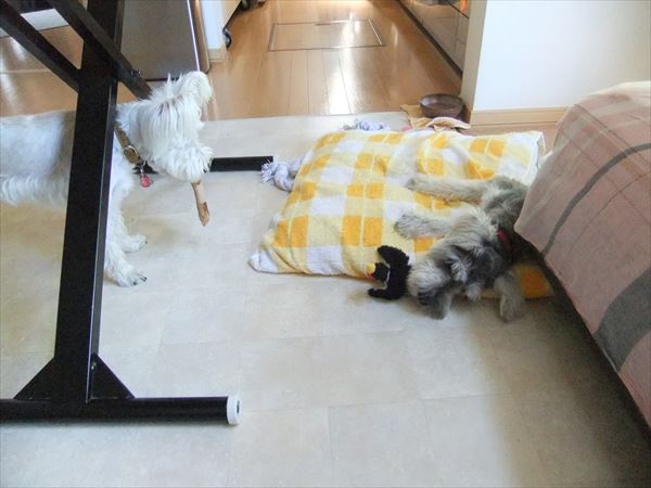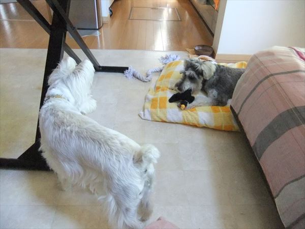 ななのくわえている棒を、取り合いっこしだしたようです。(-_-)