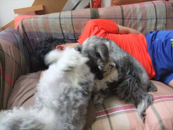 旦那さんと寝ている、ふくの邪魔をしに行きました。(-_-)