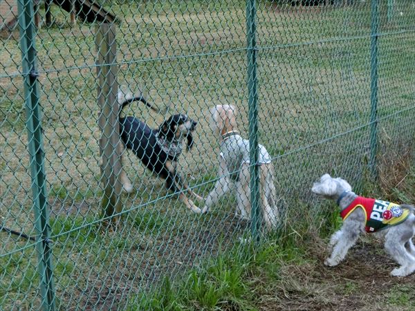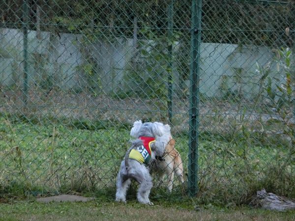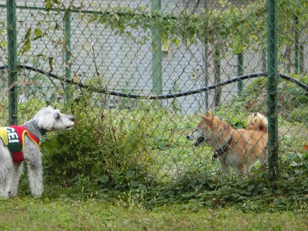 お隣のオーナーさんの柴犬とバトルしてました。