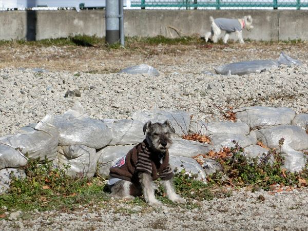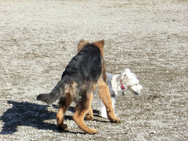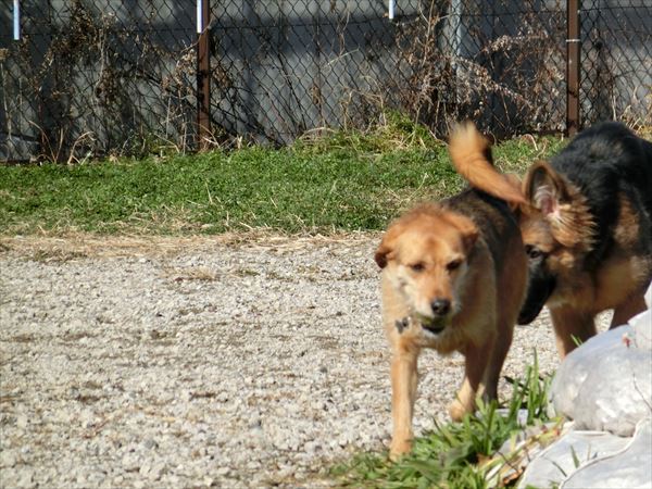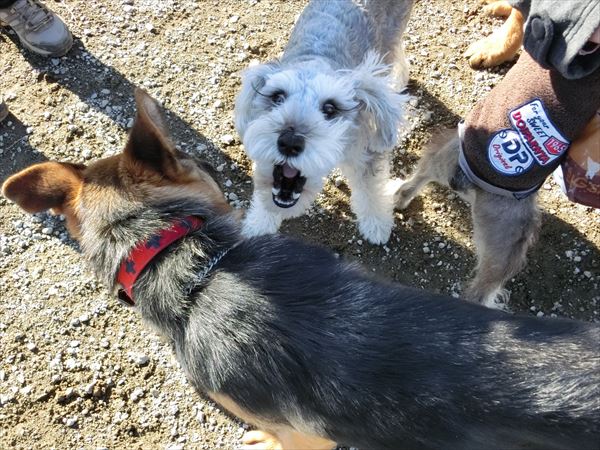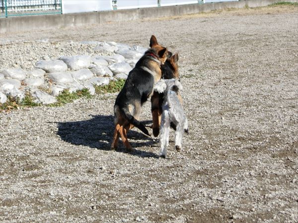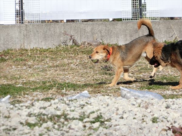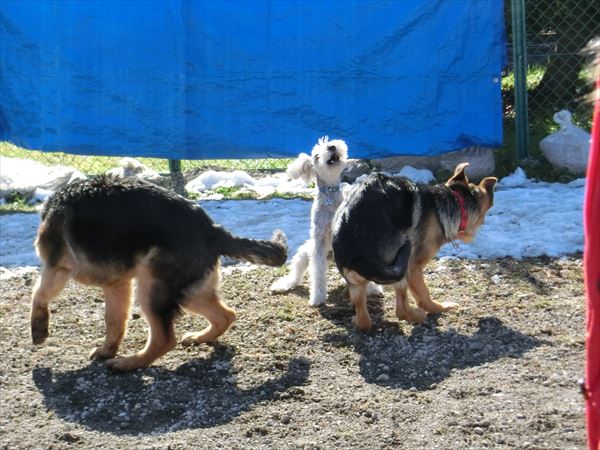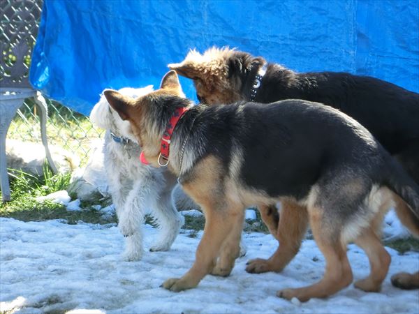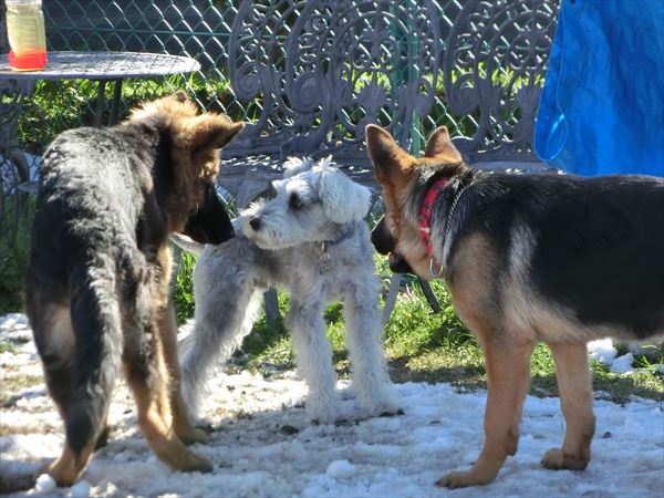 遊んでいる二人に、吠えて割り込み。(-_-)