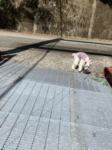 自分の足より大きな格子の前で、早速立ち尽くすなな。