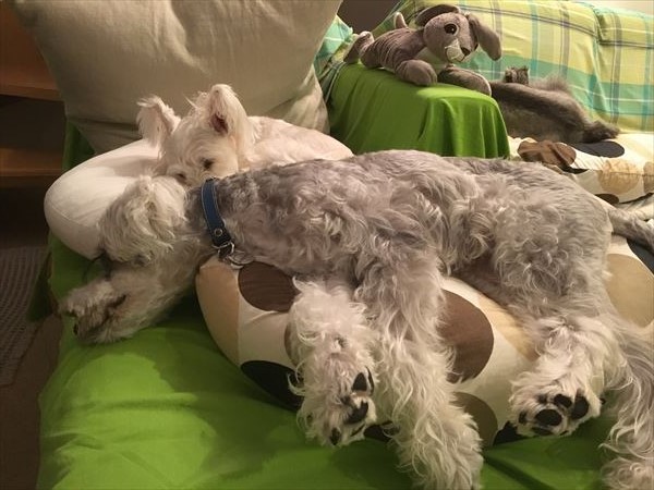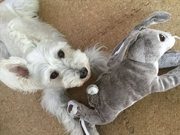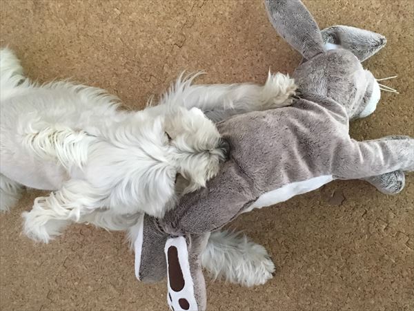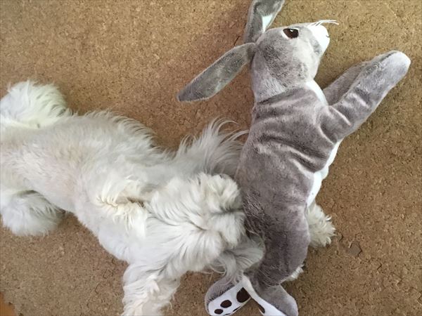 新しい仲間 じん 2017.07.27 がじがじ。 「やめてー!」 がぶっ! がぶがぶ。 あ。 その後は、一緒に寝てました。 こっちも。 こうやってみると、1人増えたように見える…かも? このうさぎ君が転がっていると、結構見間違える私です。(^^ゞ