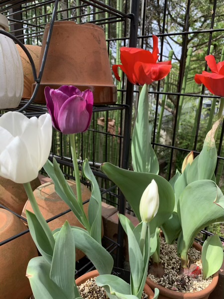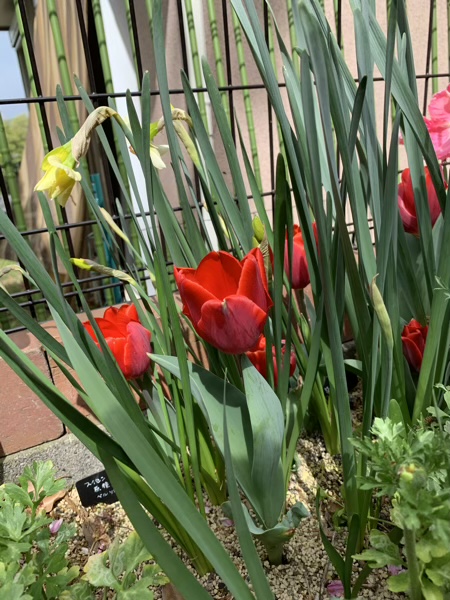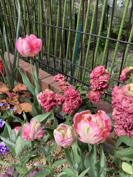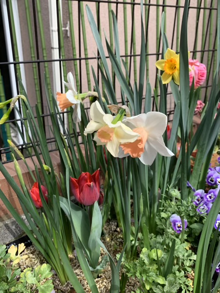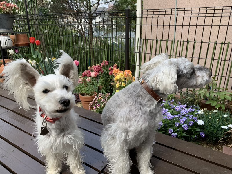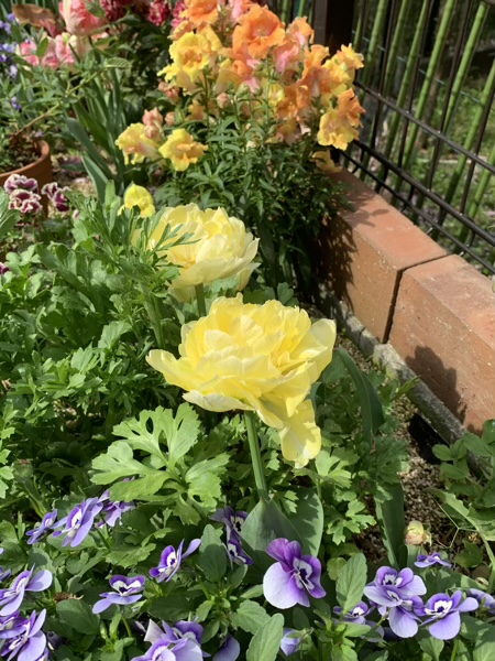 春爛漫 じん 2021.04.11 少し暑い日が続いた、ちょっと前の事。 我が家は大量のお花の山でした。(o^^o) パンジー。 チューリップ。 アプリコットパロット。 ヴェローナ。 水仙。 これから咲くかであろうお花も。 スイトピー。 小春ママにもらった芍薬。 ずっと草ぼーぼーだった我が家ですが、 昨年の小春ママとのお庭作りのおかげで、 こんなにお花がもりもりの春になりました。(^^) 記念写真。 せっかくなんだから、こっち見ようよ…。(^^;)