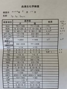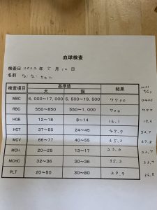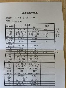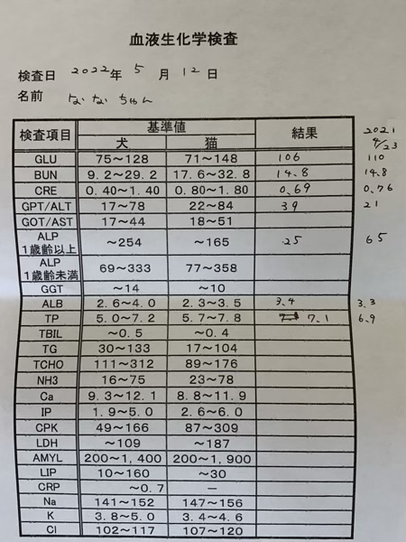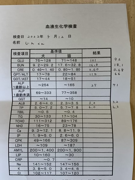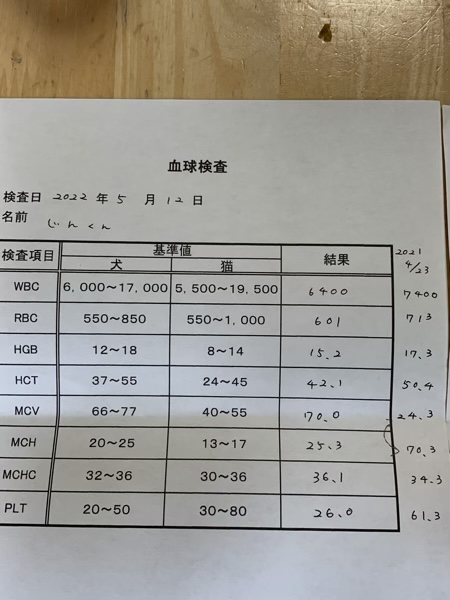 血液検査 じん 2022.05.13 そろそろフィラリアの季節。 フィラリア検査と合わせて、血液検査もしてきました。 なな。 じん。 値は、去年と多少前後はあるものの、 とりたてて病的なものはなし! ついでに狂犬病ワクチンも打って、春のイベント終了です。 今年も元気に頑張ります!