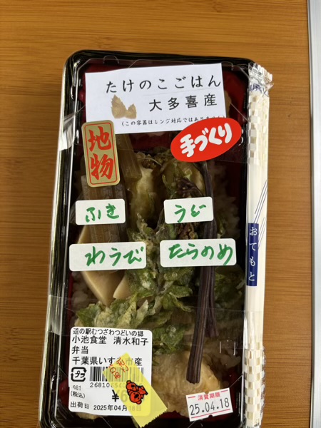 途中の道の駅で買った、山菜の天ぷらの筍ご飯のお弁当。