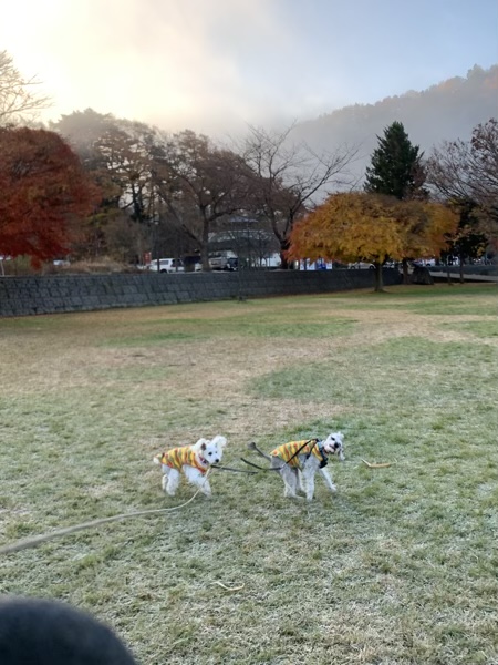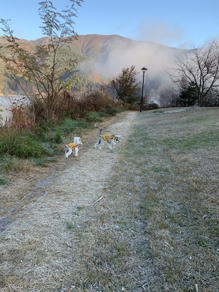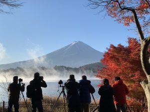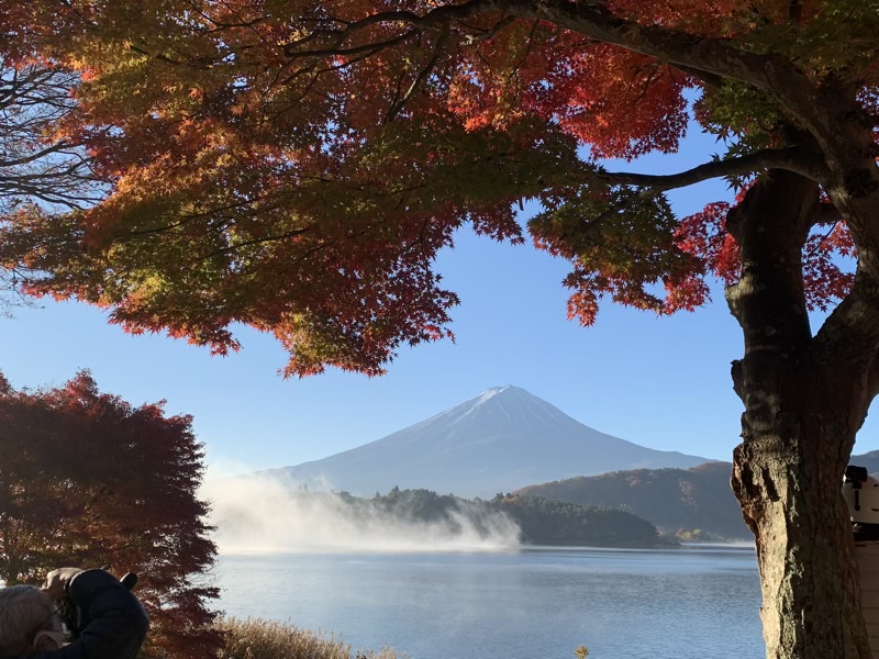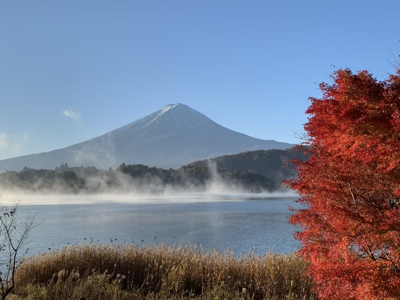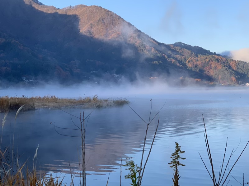 道の駅かつやま 荷開き2022 2022.11.19 昨夜は河口湖湖畔にある、道の駅かつやまで車中泊。 車内は8度ぐらいでしたが、外はなんと零下! 湖畔には遊歩道や芝生公園があり、お散歩もバッチリ。 湖霧も出てい幻想的です。 せっかくなら昨夜のもみじをみながら、 湖畔を一周して行くかと車を走らせると。 ナイス構図! と思いきや。 ここもきれい! でも実は。 カメラマンがいっぱいでした。 目的のもみじ回廊は、8時前でも既に車が多くて、 車で通り抜けしました。 こうやってみると、やはりピークは過ぎていますね。 さて、では今回の旅の目的地へ!