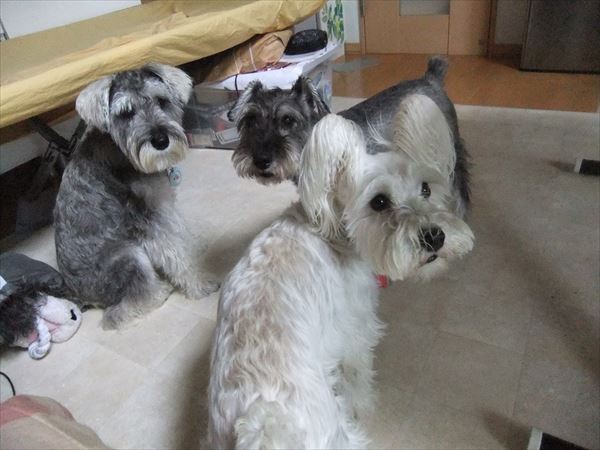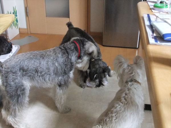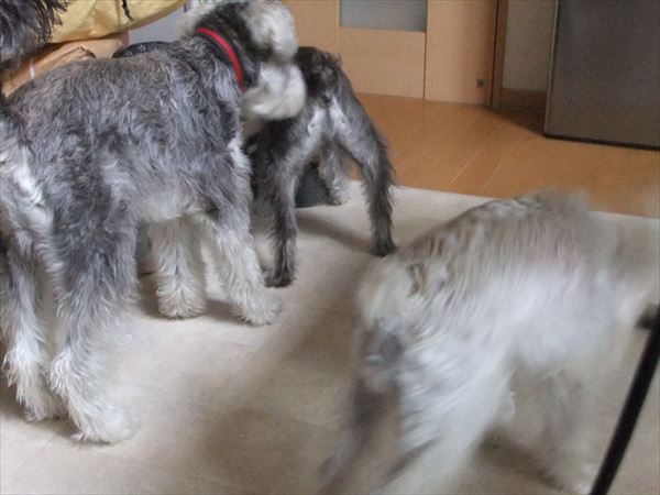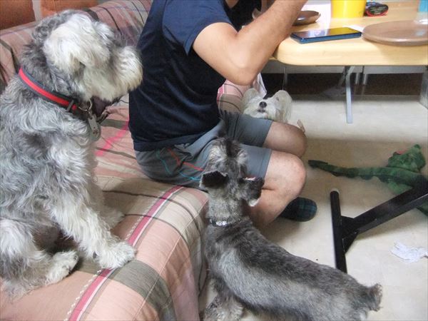 仕事に行くだんなさんの、ご飯をみんなで狙っています。