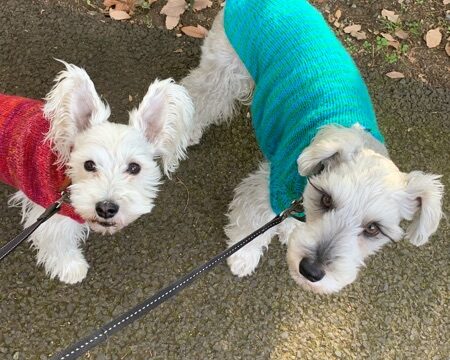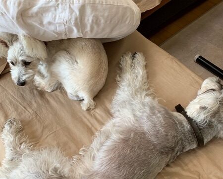 ちょっと所用で小春家へ。歓迎してくれる小春と茶々。帰ってきた私は、また染物。その横で寝てる、ななとじん。退屈かい?連れて行ってあげればよかったねー。ごめんよ。