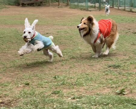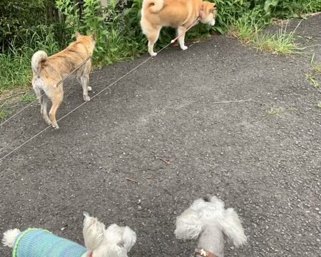 久しぶりにランに行きました。仲良くボール遊び。「…。」「あ。」「ありがとう!」ボールを譲ってくれる、優しいカイ君です。(^^)ひとしきり遊んだら、あっという間に終了。じんはふらふらするだけだし。やっぱりこのメンバーは山歩きだね〜。(^^;)