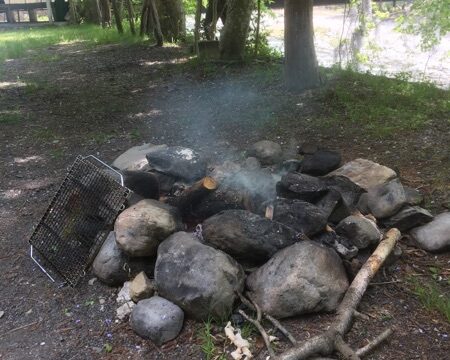 施設の説明です。サイトは草が生えているところや、砂のところがあります。砂地があるのは、直火OKだから。ところどころにこういう場所があります。こういうところ以外でも、直火OKのようです。うちが今回使ったのは、サイトの一番奥。車の後ろ側には川が...
