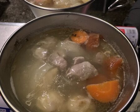 晩御飯。朝塩漬けにした豚と、ローストビーフの時ダッチで作った野菜で、スープ。味付けは、塩豚のみ。手前。たまり醤油付けのしその実を、キャベツとカブと浅漬けにしたもの。奥。さっき作った燻製ナッツ。これからアヒージョ風になるしいたけ。以上。少なそ...