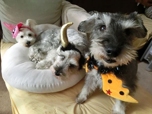 Happy Halloween! じん 2017.10.31 ハッピーハロウィン! という事で、ちょっとかぶりモノを試してみました。 なな~! ふく~!! じ~ん! ハッピーさ、皆無。 目が死んでない??(-_-) なな、ずれてる! ふく、それ、ネクタイじゃないし…。 じん、そんなに、めんどくさいか…。 やっぱり駄目だったか。 来年は止めておこう…。(^^ゞ