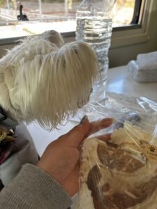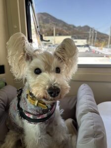 ななもお相伴。お米と名物の豚と作った犬用おやつだそうです。が、味がついていないと言うことで犬用とか。試しに食べて見たら、素材の味がめちゃ美味しい!なな、おやつをくれる旦那さんしか見なくなりました。